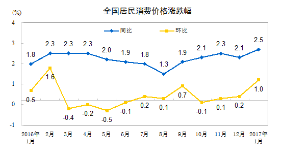 2017年1月份,全國居民消費價格總水平同比上漲2.5%。其中,城市上漲2.6%,農村上漲2.2%;食品價格上漲2.7%,非食品價格上漲2.5%;消費品價格上漲2.2%,服務價格上漲3.2%。