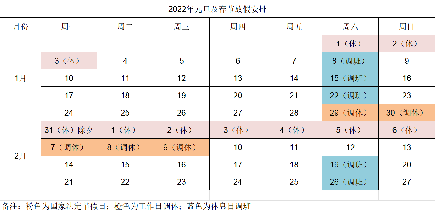 2022年元旦、春節假期將至,根據國家節假日放假規定,并結合公司實際情況,經研究決定,現將2022年公司休假安排如下:
