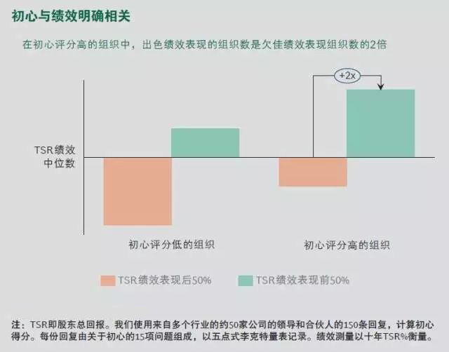 初心的回報。首先,研究表明,初心驅動的組織績效更好。我們對初心和績效之間的聯系進行了深入的分析,結果顯示,深深根植于組織的初心與十年股東總回報密切相關。