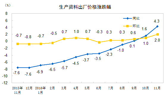 2016年11月份工業生產者出廠價格同比上漲3.3%