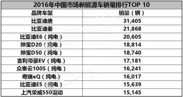 聊完美國市場,我們再把視線轉移到中國國內市場。從乘聯會發布的2016年新能源汽車銷量數據來看(進口車型沒有計入其中),比亞迪包攬前三甲,銷量均在2萬輛以上,比亞迪唐更是突破了3萬輛的門檻。