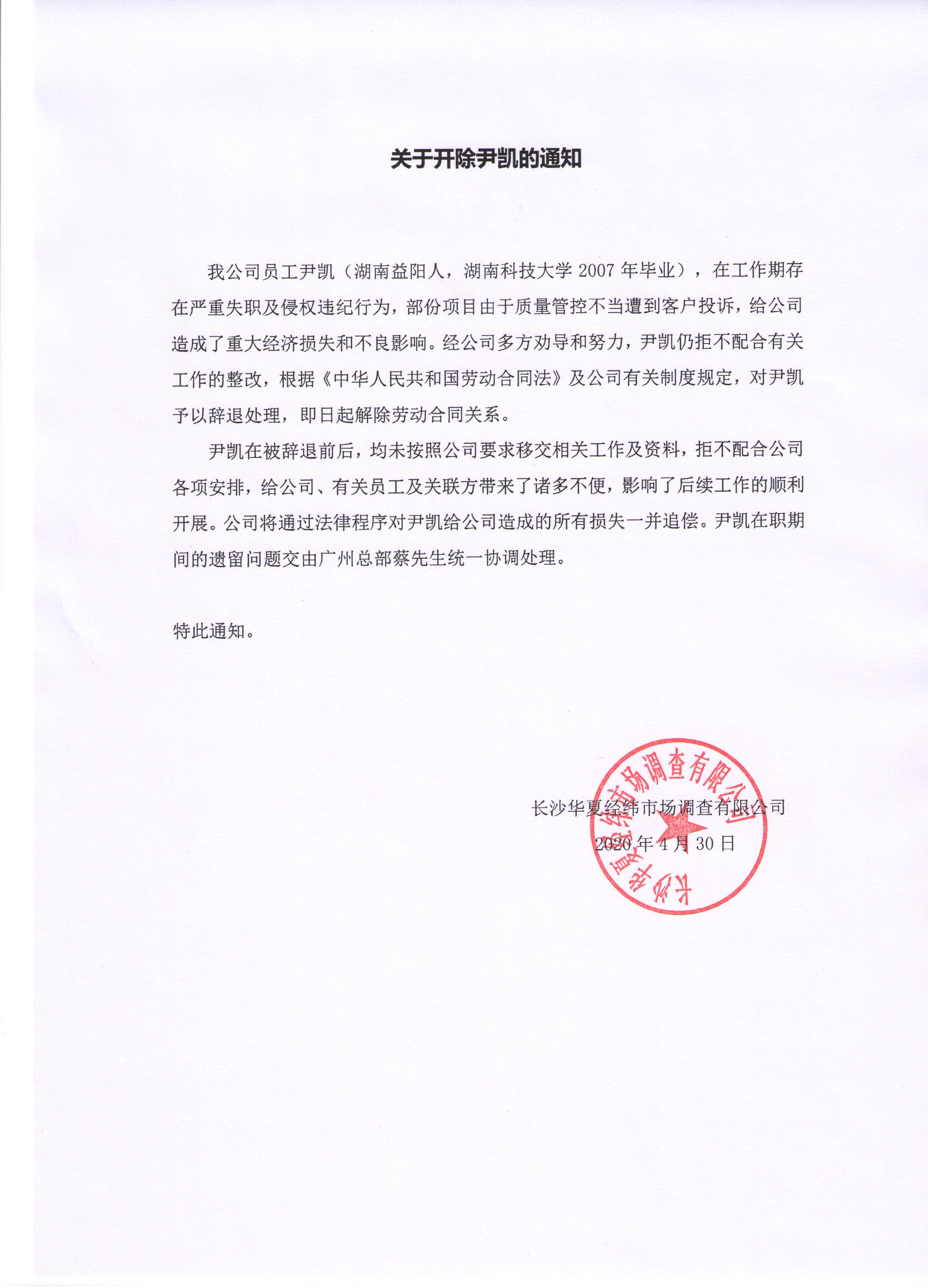 尹凱在被辭退前后,均未按照公司要求移交相關工作及資料,拒不配合公司各項安排,給公司、有關員工及關聯方帶來了諸多不便,影響了后續工作的順利開展。公司將通過法律程序對尹凱給公司造成的所有損失一并追償。尹凱在職期間的遺留問題交由廣州總部蔡先生統一協調處理。