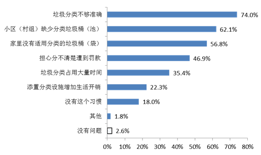 (一)受訪居民擔心實施垃圾分類后的三大主要問題是“垃圾分類不夠準確”“小區(村組)缺少分類垃圾桶(池)”和“家里沒有適用分類的垃圾桶(袋)”。